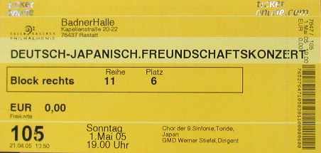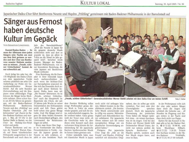 2005年4/27−5/6訪独し、バーデンバーデン市(4/30)、およびラシュタット市(5/1)で、バーデンバーデンフィルハーモニーとともに2回の演奏会で演奏し、大きな拍手を浴びました。(1995年12月の初回訪独に続き、今回は2度目の友好演奏会となりました)